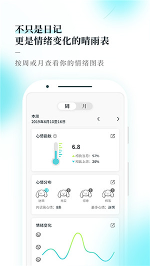 1、情绪变化,自动统计将用户每日记录的心情数据统计起来,知道变化情况。系统会智能分析用户情绪波动规律,提供专业的心理状态评估建议,帮助用户更好地了解和管理自己的情绪。