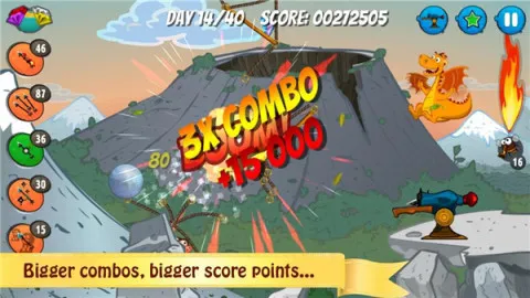 2、你需要精准控制射箭炮塔的角度和力度,将小猪头上的所有气球射爆,成功完成任务可获得积分奖励和特殊道具。