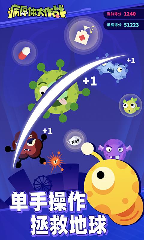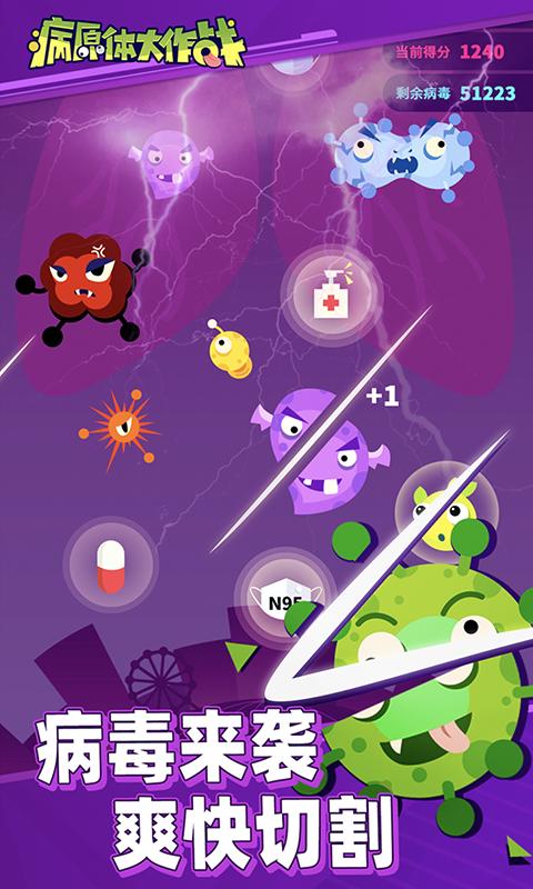 这款以抗击疫情为主题的休闲游戏,将严肃的防疫知识与轻松的游戏体验完美融合。游戏采用经典的切割玩法,玩家只需用手指在屏幕上滑动,就能操控手术刀精准消灭各种病毒。画面中会不断出现不同颜色的病毒,红色代表危险程度最高。特别需要注意的是,如果有病毒逃过攻击成功落地,角色的体温计就会上升,当累计达到40度高温时游戏就会结束。游戏还特别设计了病毒图鉴系统,让玩家在娱乐中了解各类病原体的特征。