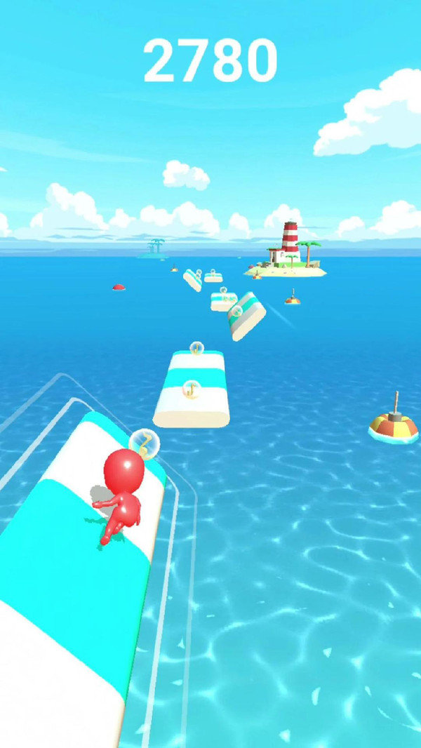 3、如果你的反应慢一点,你可能会掉进下面的海里,然后你就得重新开始。游戏采用即时失败机制,一旦失误就会立即结束当前挑战。这种设计增加了紧张感,同时也激励玩家不断提升自己的反应速度和操作精度。