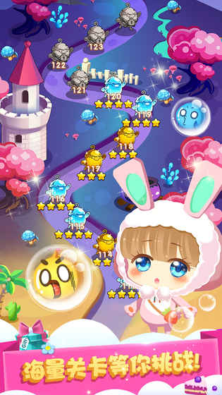 2、百变关卡:游戏在保留传统玩法精髓的同时,加入了大量创新元素。关卡设计尤为突出,从简单的入门关卡到极具挑战性的专家关卡,难度循序渐进。每个关卡都有独特的布局和过关条件,有的限时挑战,有的限制泡泡数量,有的需要特定消除方式。后续还会持续更新更多主题地图和特色关卡,确保游戏内容常玩常新。