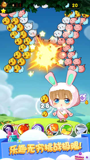 2、泡泡设计别出心裁,全都换上了可爱的小动物外衣,从憨态可掬的熊猫到机灵古怪的小狐狸,每种泡泡都有多种逗趣表情,消除时还会做出各种可爱动作;