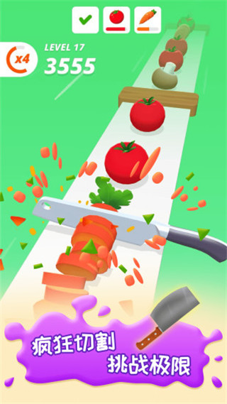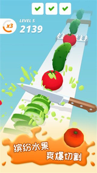 1、多个模式,开心闯关无尽挑战,更多的关卡提供。游戏包含经典模式、限时挑战和无限模式三种玩法,满足不同玩家的需求。经典模式考验玩家的精准度,限时挑战带来紧张刺激的体验,而无限模式则让玩家尽情享受切割的快感。每个模式都有独特的排行榜系统,让玩家可以与好友一较高下。