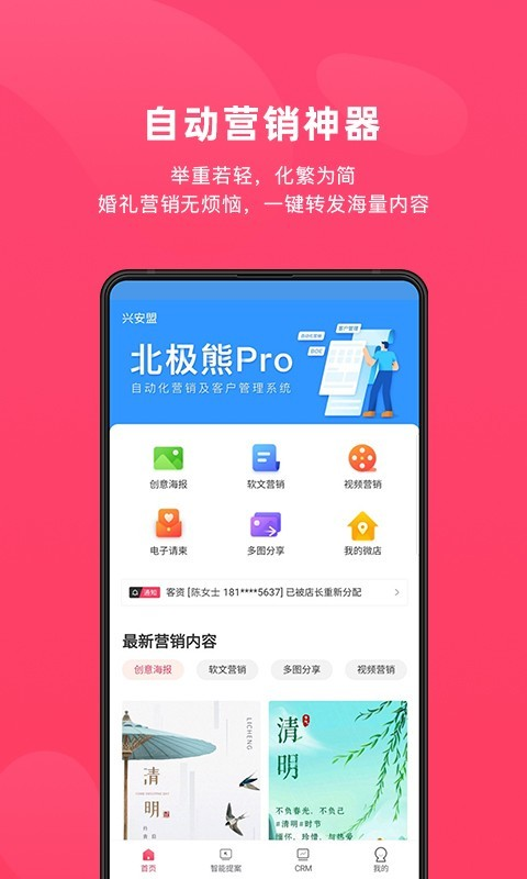 北极熊PRO安卓版是一款专为婚嫁行业量身打造的智能展业工具,致力于为从业者提供全方位的运营管理解决方案。该应用集成了海量精美海报模板、智能提案合成、多图分享等实用功能,同时配备高效的客户管理系统,帮助用户轻松实现营销推广与客户维护。无论是婚庆公司、酒店还是独立策划师,都能通过这款应用提升工作效率,打造更具吸引力的品牌形象。其简洁直观的操作界面和强大的功能组合,让婚嫁行业的数字化营销变得简单高效。