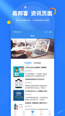 易邦客APP是一款专为企业用户打造的高效信息服务平台,致力于为企业与合作伙伴搭建无缝沟通的桥梁。通过整合行业动态、企业新闻及合作资源,该平台不仅帮助用户实时掌握商业资讯,还能智能匹配潜在合作机会,大幅提升商务对接效率。其简洁直观的界面设计配合强大的数据支持,让企业信息管理变得轻松便捷,真正实现"一键触达商机"。无论是初创团队还是大型企业,都能在这里找到专属的商业解决方案,开启高效协作新时代。
