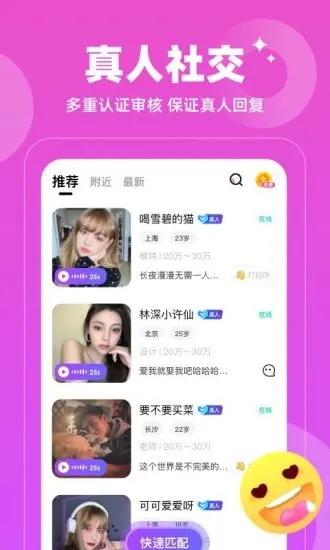 -语玩交友:平台独创的声纹匹配技术,能根据你的声音特质推荐最合适的聊天对象。无论是温柔细语还是爽朗笑声,都能在这里找到欣赏你的人。我们还准备了丰富的语音互动游戏,让破冰过程充满乐趣。