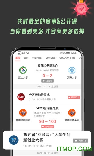 【实时的赛事&公开课】体育赛事实时数据播报;科研创业大赛;校园十佳歌手;名师公开课;名企空中宣讲会一应俱全。我们与各大高校体育部、教务处保持紧密合作,确保第一时间更新赛事信息和课程安排。对于重要赛事,我们还提供直播服务和赛后精彩回放,让你不错过任何精彩瞬间。