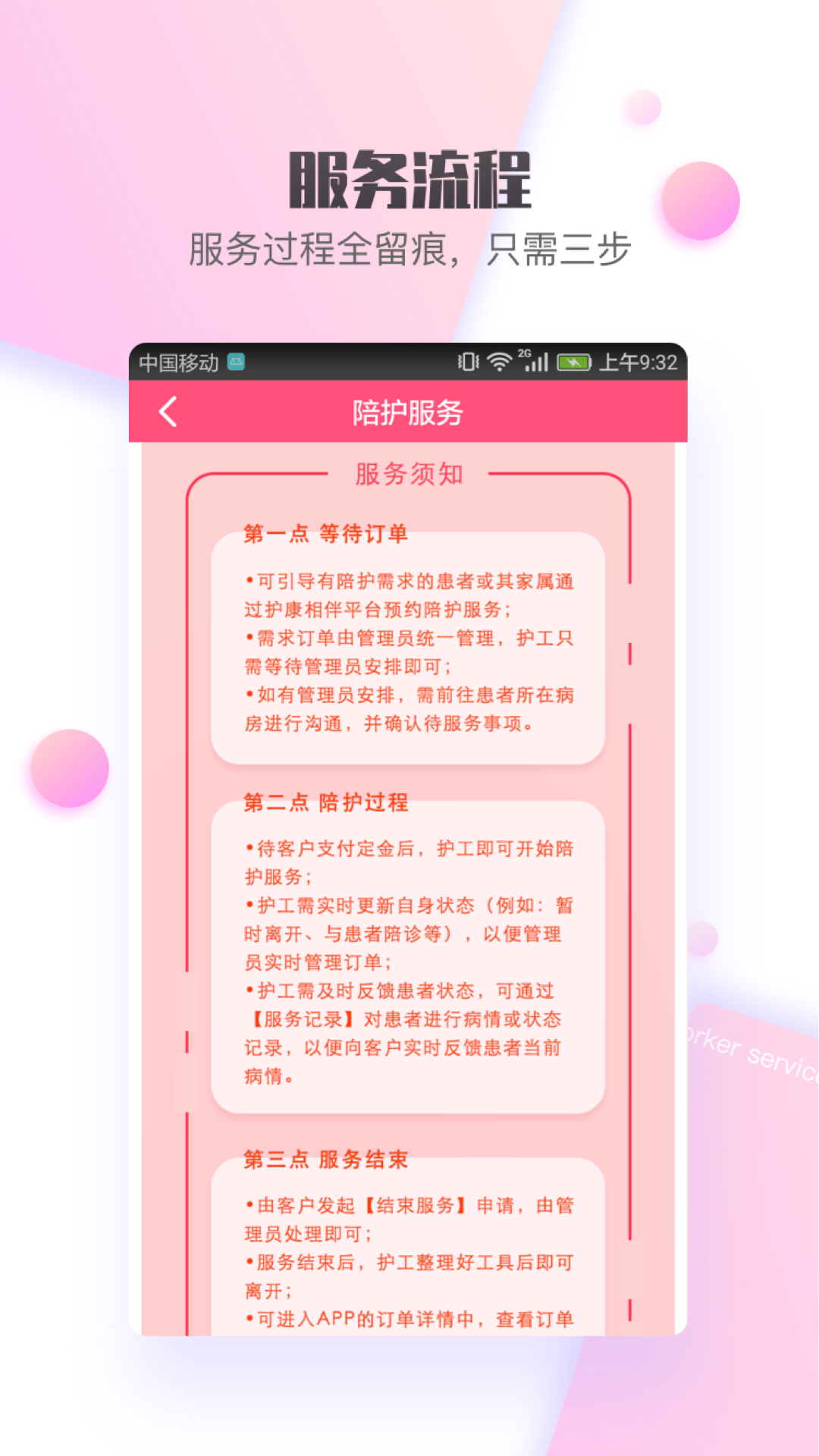 护康护理平台由南方医科大学科技园提供专业技术支持,结合医院实际业务场景深度开发。平台已整合全国超过1万名专业护工资源,建立了完善的服务质量监控体系。护康相伴护工端APP配备实时定位、服务过程全记录、电子合同签署等功能,确保服务过程透明可追溯。同时平台还提供专业责任险、紧急求助等安全保障措施,为护工和客户构建全方位的保护机制,让陪护服务更安心、更可靠。