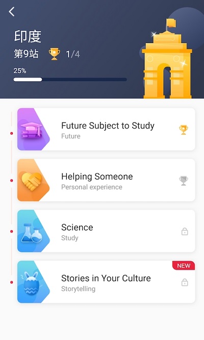 3.独创"脚手架"学习模式,从跟读模仿到自由辩论设置8个进阶阶段,每个阶段配备专属激励体系,循序渐进培养表达自信。