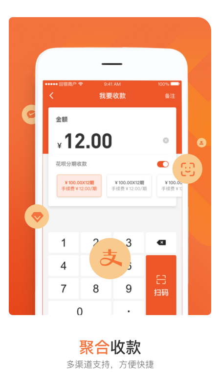 1.回银聚合刷脸支付:采用先进的人脸识别技术,0.3秒极速完成支付验证,资金实时到账并伴有语音播报功能。作为支付宝、微信支付、QQ钱包等主流移动支付的官方授权服务商,确保每笔交易安全可靠。特别适合人流量大的零售门店使用,能显著提升收银效率。