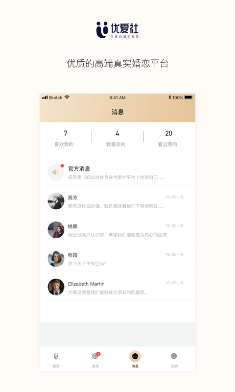 优爱社APP拥有四大核心功能模块:首页、发现、消息和个人中心。首页采用智能推荐算法,根据您的兴趣爱好和择偶标准,精准匹配优质对象;发现板块让您探索更多潜在缘分;消息中心方便您与心仪对象实时互动;个人中心则提供完善的资料管理功能。平台还设有严格的真实性认证流程,包括人工审核和全面资料审核,确保每位用户的真实性。用户发布的每一条动态都需要经过人工审核,杜绝虚假信息,为您打造纯净的交友空间。