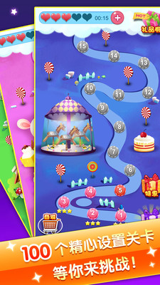 6大主题、100个关卡,丰富多变的关卡系统带给你;游戏设置了多个主题场景,如巧克力工厂、糖果王国等,每个主题都有独特的视觉风格和关卡设计。