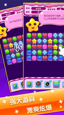 2、精美的画风,酷炫的特效,给你最完美的游戏体验;游戏采用高清画质,糖果造型可爱生动,消除特效华丽炫目,配合轻快的背景音乐,营造出愉悦的游戏氛围。