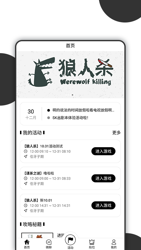 1"首页"快捷进入游戏界面和查看我参加的活动,直观展示最新热门局和推荐活动,让你第一时间掌握精彩内容;