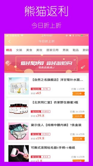 2、熊猫返利每天为您搜索各大电商平台内部优惠券。强大的数据爬虫系统实时监控全网价格波动,第一时间推送限时特惠,不错过任何省钱机会。