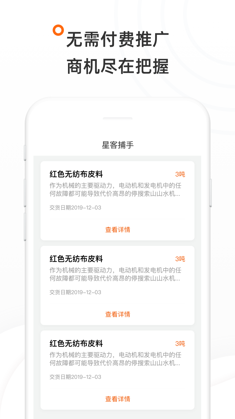 无需繁琐流程,商机尽在把握。企服星球商户端通过智能算法实时推送精准商机,让商家不错过任何合作机会。系统自动匹配供需双方,大幅缩短交易周期,提升业务效率。客户在线合作,订单聊天完成。内置即时通讯功能支持文字、语音、图片等多种沟通方式,订单洽谈、合同确认一站式完成,省去来回沟通的麻烦。内外程序一体化,实时把控进度。生产数据与企业内部ERP系统无缝对接,从原料采购到成品出库全流程可视化,管理者可随时查看各环节状态。托盘共享买卖,新的利润增长点。创新性地推出托盘资源共享功能,让闲置托盘变现,同时降低其他企业的物流成本,实现双赢。