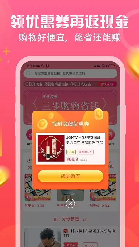 【方便快捷】只需复制淘宝商品链接,系统自动匹配最优优惠券,省去繁琐搜索时间;