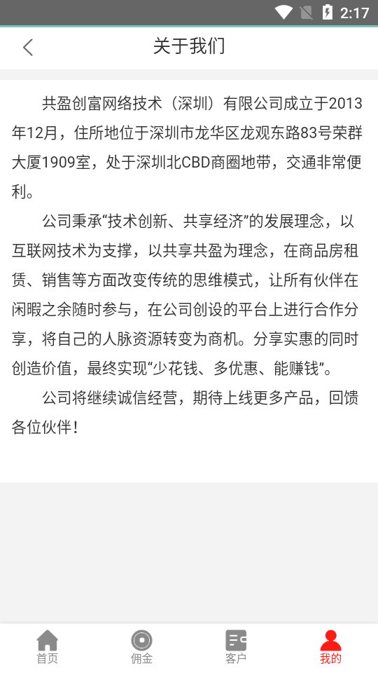 共盈创富网络技术(深圳)有限公司成立于2013年12月,总部位于深圳市龙华区民治街道民强社区民田路民福楼B203,地处深圳北CBD商圈核心地带,交通便利,区位优势显著。公司秉承“技术创新、共享经济”的发展理念,以互联网技术为支撑,致力于在商品房租赁、销售等领域打破传统模式,为用户提供更高效、更透明的服务。通过平台合作分享机制,用户可以将人脉资源转化为商机,在享受实惠的同时实现额外收益。未来,公司将继续坚持诚信经营,推出更多优质产品,回馈广大用户的支持与信任。