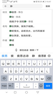 2、搜索功能很方便:支持模糊搜索、作者检索、朝代筛选等12种查询方式。最近新增AI语义搜索,能用白话描述查找相关诗词。