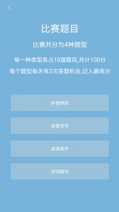 汉字大赛官方版是一款寓教于乐的汉语学习软件,通过趣味答题的形式帮助用户提升汉语水平。软件包含丰富的题型,如拼音、写字、成语、诗词等,让用户在挑战中掌握汉语知识。每天参与答题挑战,不仅能积累汉字知识,还能在排行榜上与其他用户一较高下,激发学习动力。界面简洁友好,操作便捷,适合各个年龄段的汉语爱好者使用。快来下载体验,感受中华文化的博大精深吧!