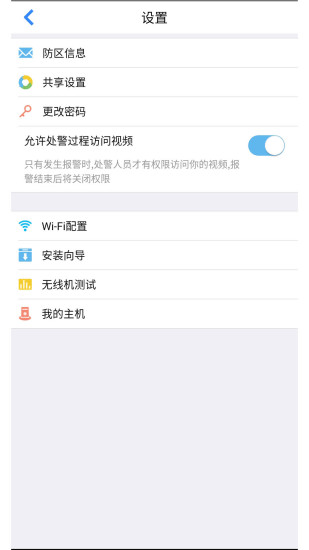 防区与摄像头的报警联动设置:在"更多"页面的"设置"中选择"共享设置"功能。用户可以添加需要分享的区域设备,并输入被分享用户的穿云箭APP注册手机号码。被分享用户将获得相应的设备查看和控制权限。