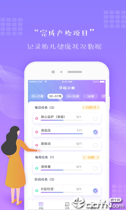 "完成产检项目"功能提供详细的产检时间表和注意事项,帮助孕妈妈不错过任何重要检查。系统会根据孕周自动提醒下次产检时间,并提前告知需要准备的事项。