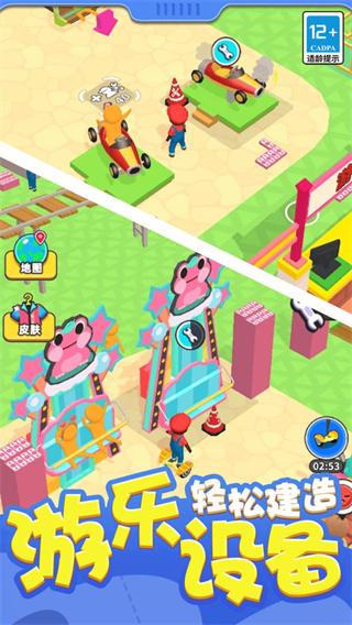 3、没有包含任何血腥场面或者是暴力画面,提供了安全的游玩体验,适合男女老少享受游戏带来的和体验。游戏内容健康向上,充满正能量。欢乐的音乐、可爱的角色设计、轻松的游戏氛围,让玩家在经营游乐场的过程中收获快乐。家长可以放心让孩子游玩,全家人一起享受建造和经营的乐趣。