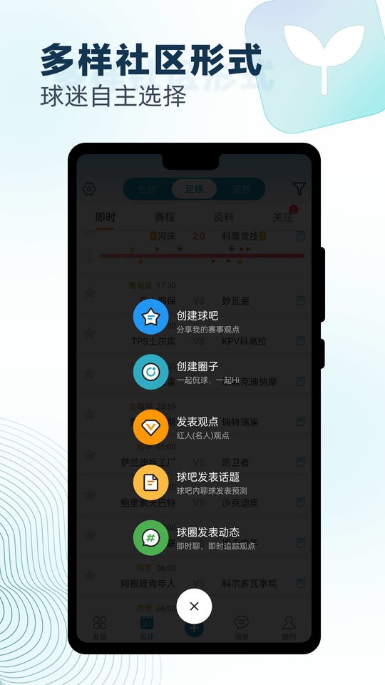 5、点击底部"+"按钮,可发表个人观点、创建专属球吧或圈子,分享独特的赛事见解和分析。