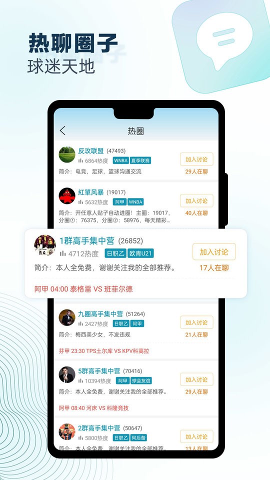 4、在动态栏点击上方球圈选项,可查看并加入不同赛事板块的讨论圈子,与同好交流观赛心得。