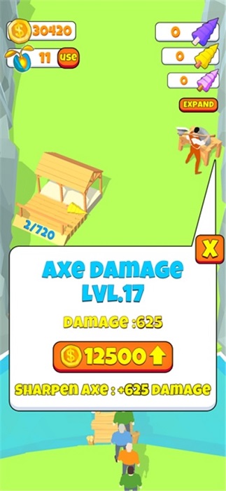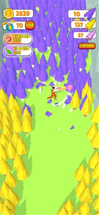 a、游戏设有完善的装备升级系统,当玩家积累足够金币后,可以购买电锯、伐木机等高级工具,这些工具不仅能提高工作效率,还能解锁特殊砍伐效果。玩家需要根据不同的树木类型,灵活选择合适的工具组合。