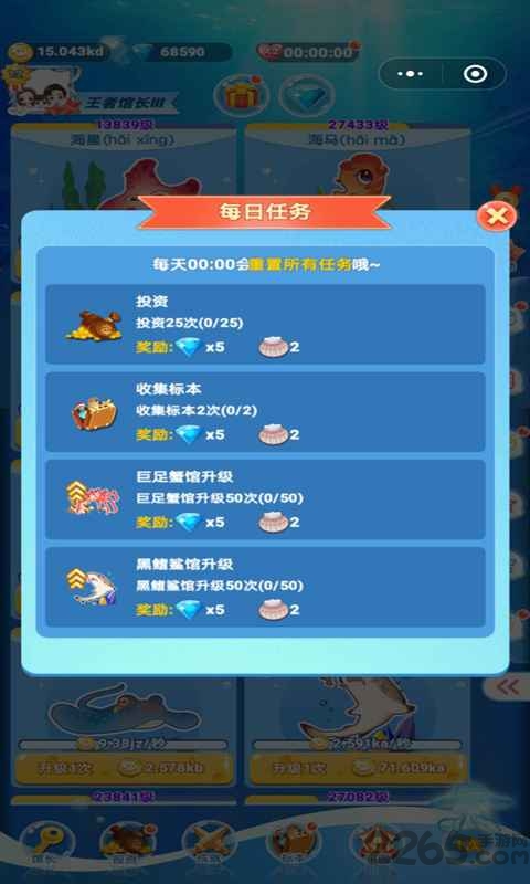 4、帮助你通过努力,不断扩大你的水族馆,最终成为一个全新的大亨。从社区小水族店起步,通过品牌建设、连锁经营最终打造全球知名的海洋主题公园。