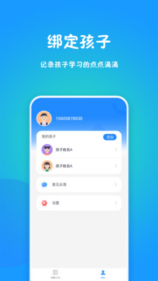 5.绑定孩子:家长可实时查看孩子的学习进度和成绩变化,全面掌握学习情况。