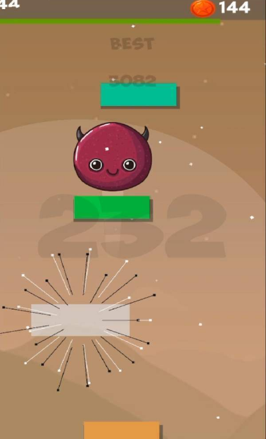 4、自由移动,每个台阶玩家都可自由跳跃移动,需要注意周围的尖刺会破坏你的身体。游戏加入独创的"二段跳"机制,在危险时刻能化险为夷,但需要合理控制使用次数。