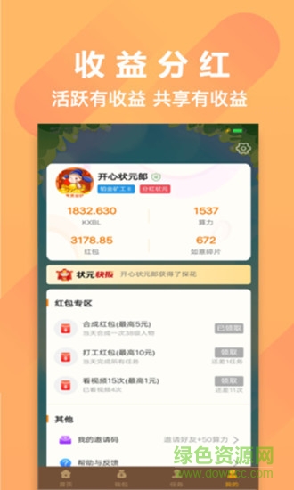 分红状元是游戏的核心收益来源,持有者可以享受平台每日广告收益的20%分红。通过五福合成必定获得分红状元,普通合成也有概率获得。每个分红状元都有独立编号,系统会精确计算每个状元带来的分红收益。分红金额每日自动结算,玩家可以随时查看明细。