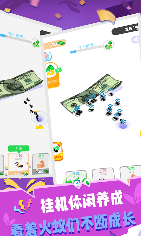 这是一款轻松有趣的休闲放置游戏,完美模拟了自然界中蚂蚁团队协作搬运食物的奇妙场景。在游戏中,你可以通过金币购买不同种类的蚂蚁,还能对它们进行升级强化,提高整体运输效率。随着游戏进程的推进,你将解锁更多有趣的玩法内容,包括多个风格迥异的新世界地图。每个世界都充满了独特的挑战和惊喜,让玩家能够持续保持新鲜感。游戏还支持离线收益,即使关闭游戏,你的蚂蚁军团也会继续为你收集资源。