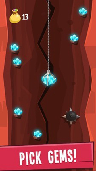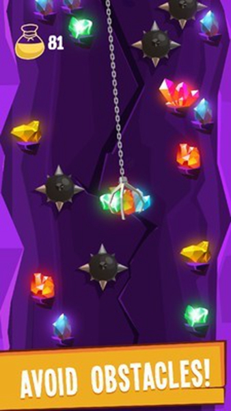2、游戏核心操作是控制钩爪的摆动和释放时机。玩家需要观察矿石的摆动规律,在最合适的时机出手。同时要特别注意避开黑色炸弹,它们会摧毁已经获得的战利品。