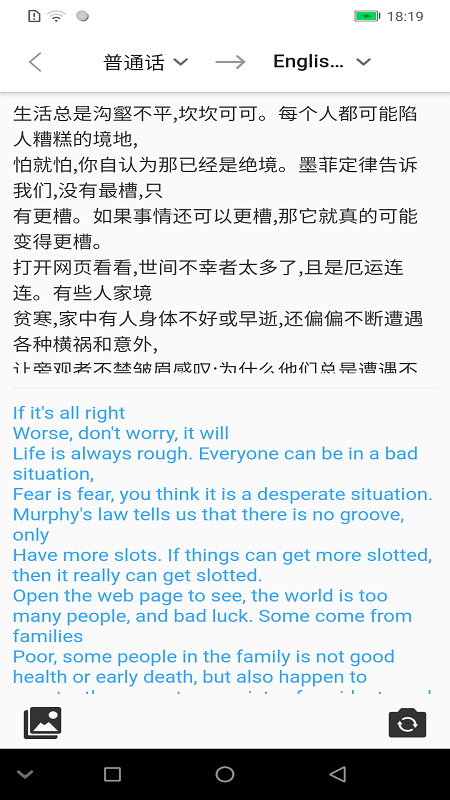 3、拍照翻译:通过手机摄像头拍摄外文资料,APP会自动识别图片中的文字并进行翻译。支持菜单、路牌、说明书等多种场景,翻译结果可保存至本地,方便随时查阅。