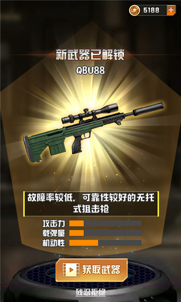 1、这些资源都是非常的强大的武器,玩家需要不断的购买弹夹,每一次的挑战都需要准备充分的子弹;战术背包系统可携带三种主武器,智能弹药管理系统会根据战场情况自动切换弹种。特殊穿甲弹能对装甲目标造成额外伤害。