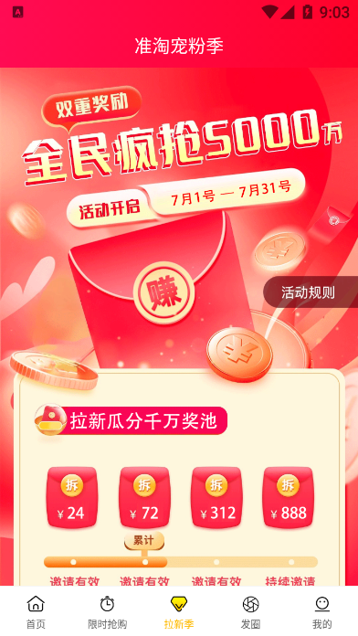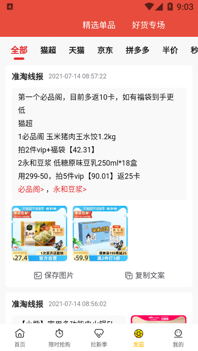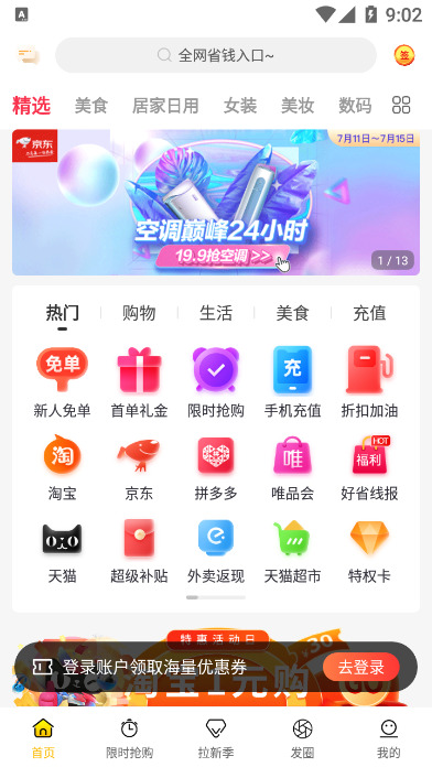 2、【特色板块,功能齐全】平台设有9块9包邮、每日爆款、品牌特价、限时抢购、生活券等特色板块,满足不同用户的购物需求,功能丰富且实用。