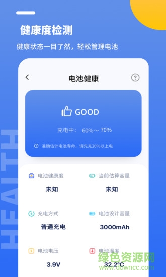 --》进入app用户可以开始对手机进行硬件检测,全面了解电池健康状况和使用情况;