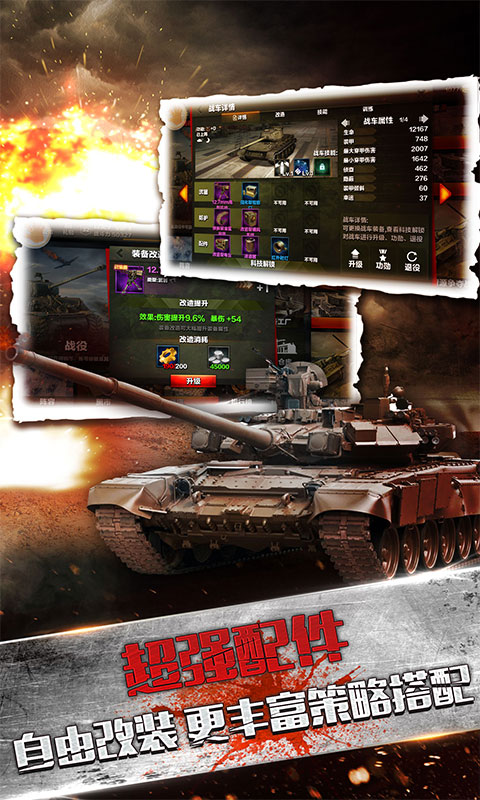 4、自由改装:超强配件系统,支持自由改装坦克,丰富的策略搭配让你在战场上更具优势;