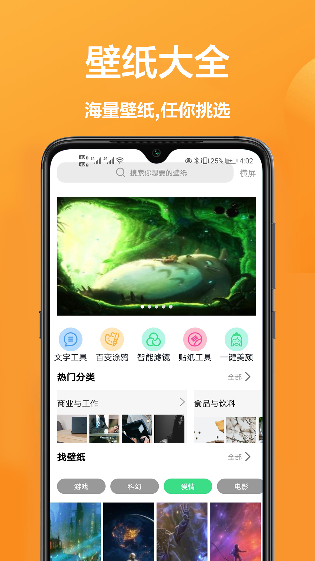 1、壁纸大全:拥有超过500万张版权壁纸资源,与全球100+知名摄影师、插画师合作。独家签约迪士尼、漫威等IP正版授权,提供影视动漫专属内容。