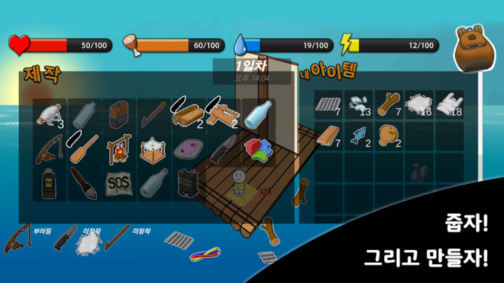 3、海洋中漂浮着大量可利用的物资,从木板、塑料桶到各种金属零件应有尽有。玩家需要用钩子将这些物资打捞上来,通过巧妙的组合创造出各种生存工具。随着收集的物资越来越多,你可以将木筏扩建为多层结构,增加储物空间和功能区域。合理规划木筏布局是长期生存的关键。