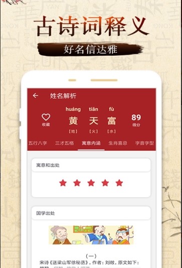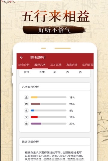 2.解名功能:通过三才五格、八字五行、周易卦象等多维度分析,详细解读名字背后的深层寓意。