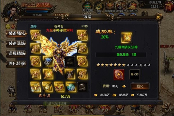 游戏提供爽快无比的PVP玩法,皇城争霸让你体验畅快淋漓的PK对决;丰富的成长系统包括坐骑、翅膀、元神、成就、灵石等,助你全面提升战力;BOSS系统带来激情挑战,击败强敌可获得丰厚奖励;PVE玩法如魔龙秘境、幻境、邪神入侵等,考验你的策略与操作;休闲玩法如城主贺寿、烤火、天降财神等,让你在紧张战斗之余放松身心;全自由化PK设定,除特定安全区和摆摊区外,战斗不受限制,让你尽情享受原汁原味的传奇PK,装备爆率超高,战斗更刺激!