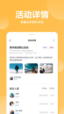 活动详情:每个活动都有完整的详情页面,包含时间、地点、参与人数、费用说明等关键信息,方便用户做出参与决策。
