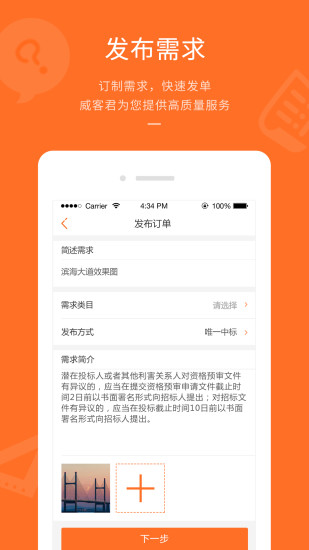 1.发布需求——通过智能表单快速发布设计需求,系统将根据项目类型、预算和风格偏好,自动匹配最合适的服务商。支持上传参考图片和详细说明文档,确保需求表达准确无误。