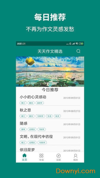3.提供写人、叙事、书信、诗歌、议论、写景等45种主题类别的好作文,并可以根据你的年级筛选。每种文体都有详细写作指南和范例解析。
