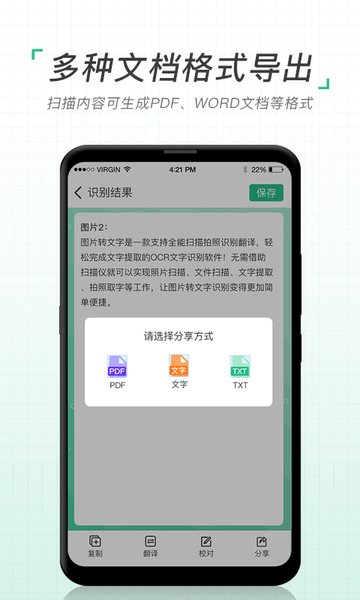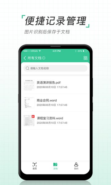图片转文字扫描仪2021是一款全能型的OCR识别工具,它不仅支持拍照扫描和文字提取,还能实现图片翻译、格式转换等多项实用功能。用户无需购买专业扫描设备,只需使用手机摄像头就能完成文档数字化工作。该软件采用先进的图像处理技术,能够精准识别图片中的文字内容,无论是印刷体还是手写体都能获得不错的识别效果。同时,软件界面简洁友好,操作流程直观,即使是初次使用的用户也能快速上手。