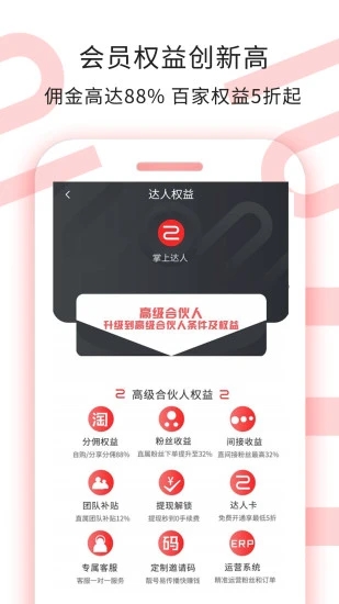 掌上达人独创的会员成长体系,让用户享受阶梯式返利优惠。普通用户可享基础返利,VIP会员最高可获得88%的佣金返还。平台还联合100+生活服务品牌,为会员提供包括外卖、打车、视频会员等在内的5折起专属权益,真正实现"一卡在手,生活无忧"的智能消费体验。